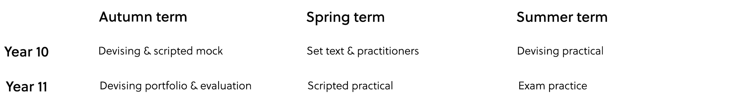 Component 1: Devising - This gives students the opportunity to create an original performance that is based on a studied practitioner and a given stimulus. This is completed in groups and is supported by a portfolio. The portfolio allows for reflection on the devising process and how each student has contributed to the performance as a whole.