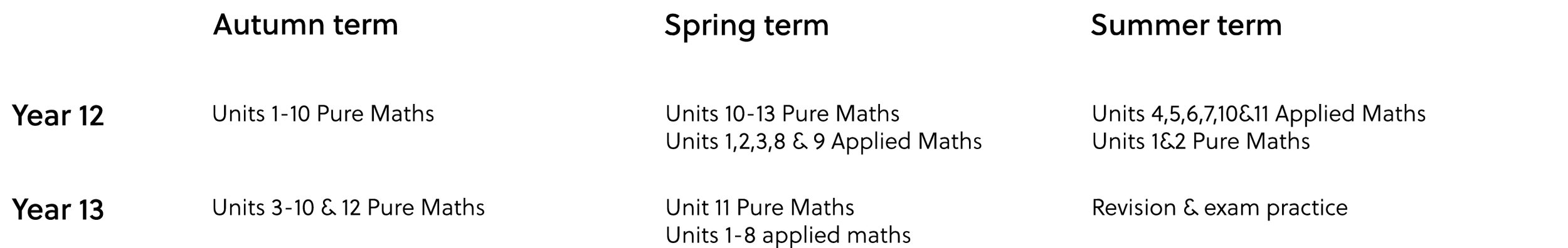 Core Maths builds on areas of Algebra, Trigonometry and Coordinate Geometry learnt at GCSE, Mechanics takes elements of Physics from KS4 and delves into forces and the motion of objects.